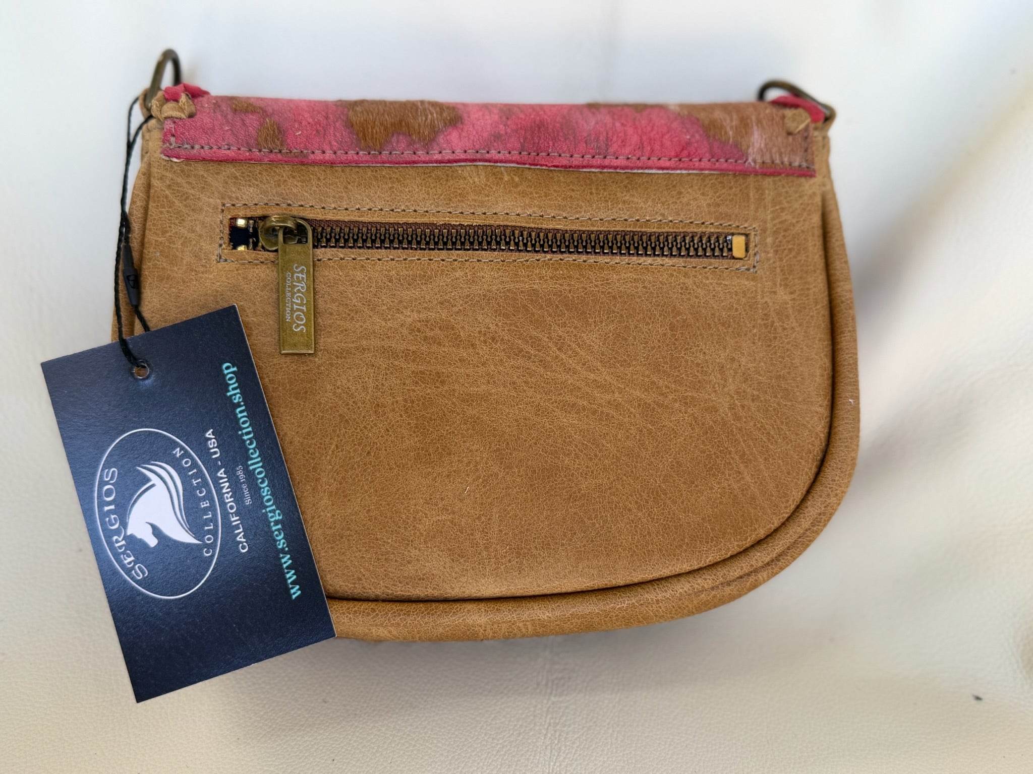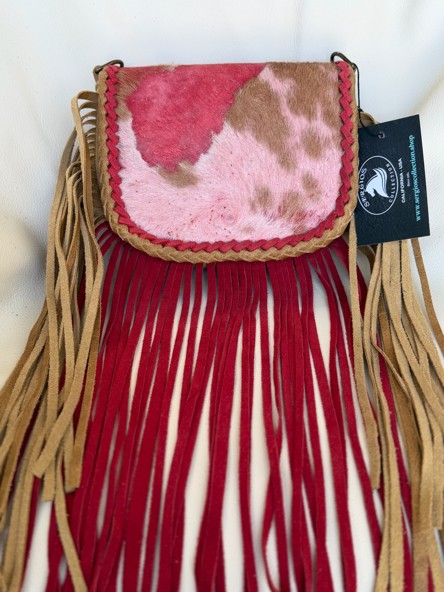 The technique of acid wash cowhide partially removes some of the cowhide hair, then the hide is dyed in a color such as turquoise or red. This particular Barbie bag has acid wash Red dyed cowhide and tan leather. It has a double braided trim and a crossbody strap.
